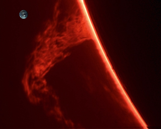 08.06.2004, 05:17 UT . At upper left our earth (diameter 12756 km) is displayed at the right scale for comparision of size.